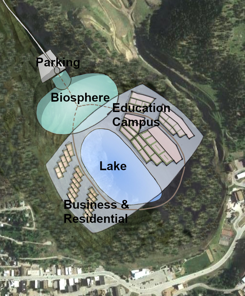 Multiple or one large biosphere will be a major feature of the project on the north side where the topography is more level. Biospheres are used for better control of and create various environmental conditions for studying and growing plants and crops. These plants and crops can be used for research, education, and local food. The biospheres will not only be used for research and commerce, but for educational programs and visitor tours.