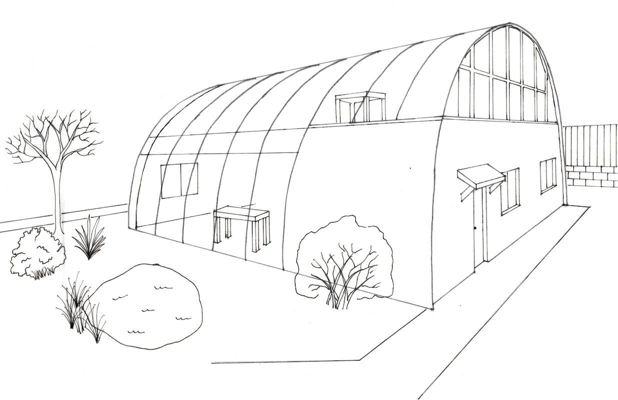 The Hut aspect of the Hut-Cut project will be a place to test on a small scale the different aspects and strategies incorporated into the larger project in The Cut. It would also be used as a local outreach location and headquarters for the whole project. Analogous to The Cut, this location will comprise education space, office space, indoor horticultural areas, a lab/workroom, outdoor garden, aquaculture, water collection, and solar panels. Replacing 50 to 70 percent of the exterior shell with transparent/translucent panels and installing a window wall on the upper south wall will create a greenhouse space for horticulture on the whole upstairs level, akin to the biosphere. These panels, like the large lightweight roof structure over The Open Cut, can integrate tempered solar panels and water collection. Education programs will use the classroom downstairs to teach the community in the same areas of interest embedded in The Cut project: environment, horticulture, gardening, mining, geology, nutrition, soil studies, composting and vermiculture. The office space would mainly be used for the project and employees and volunteers at The Hut. Outside, the west side is where a small scale aquaculture system would be set up along with a garden in view of the walking and driving public.